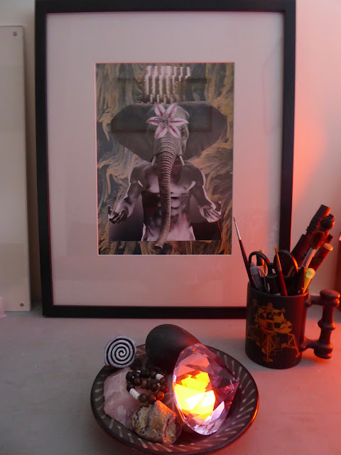 Ive tried to create an atmospheric space, an installation of sorts where my surrealist collages can play off each other.